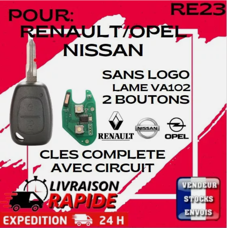 Télécommande Compatible Renault, Opel, Nissan – Avec Transpondeur ID46 🔑 Clé télécommande complète avec transpondeur et lame fournie ! Caractéristiques : ✔ Référence usine : 2826800QAD✔ Transpondeur : ID46 – PCF7946✔ Fréquence : 433,9 MHz (modulation ASK)✔ Programmation transpondeur : OBD✔ Programmation télécommande : Automatique avec le transpondeur✔ Lame : NE73 ou VAC102 (fournies)✔ Pile : CR1225 (incluse)